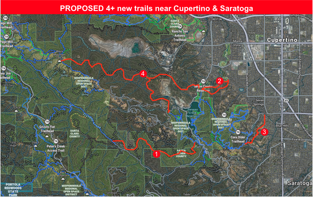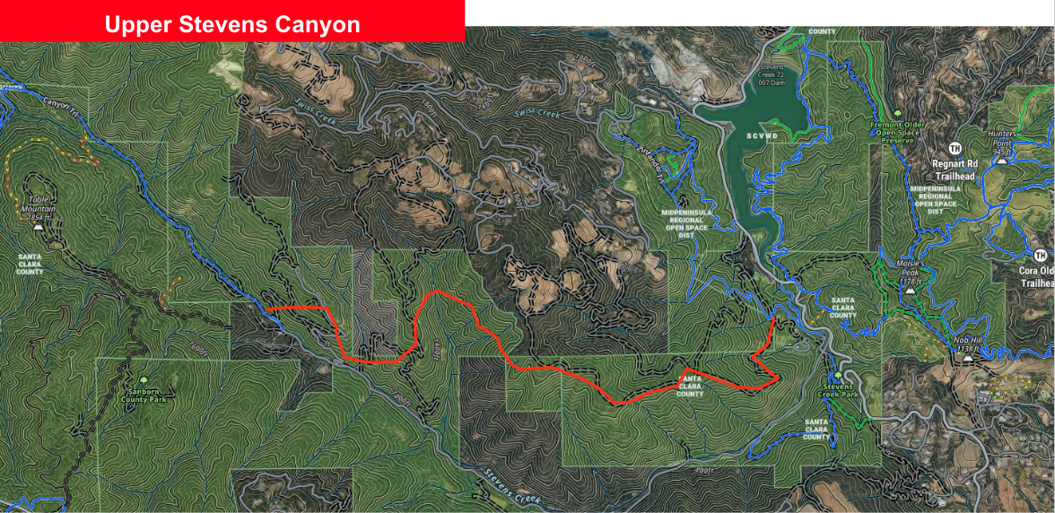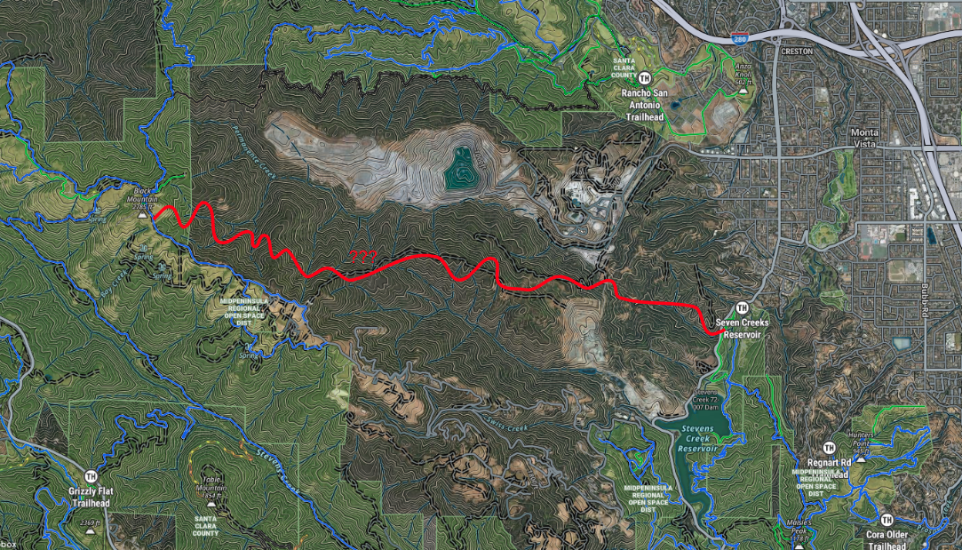 - Create a new trail linking Stevens Canyon Rd (near Picchetti Ranch / Stevens Creek Reservoir) to Canyon Trail in Monte Bello OSP (near the Table Mountain junction).